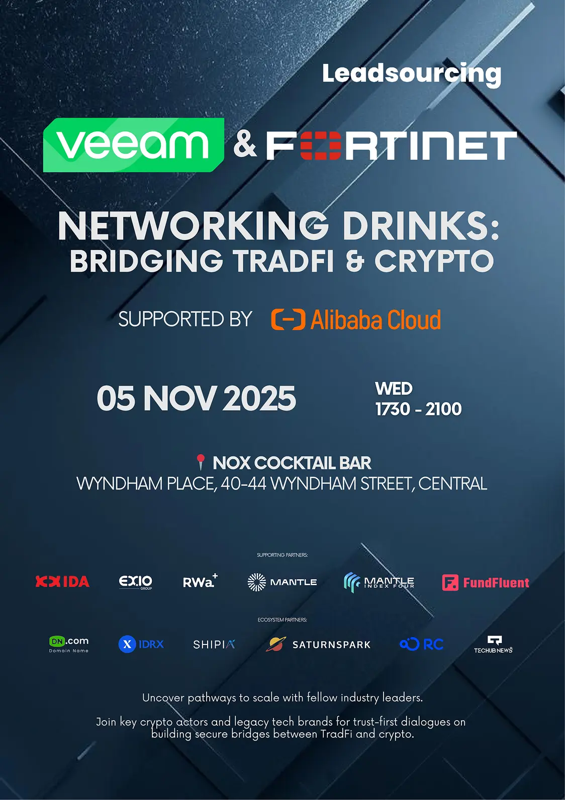 On November 5th, the doors open at Nox Cocktail Bar, Central, and Hong Kong’s most ambitious crypto teams will trade their lanyards for real drinks and real deals, face-to-face with the Legacy Tech giants and institutional buyers who power TradFi.