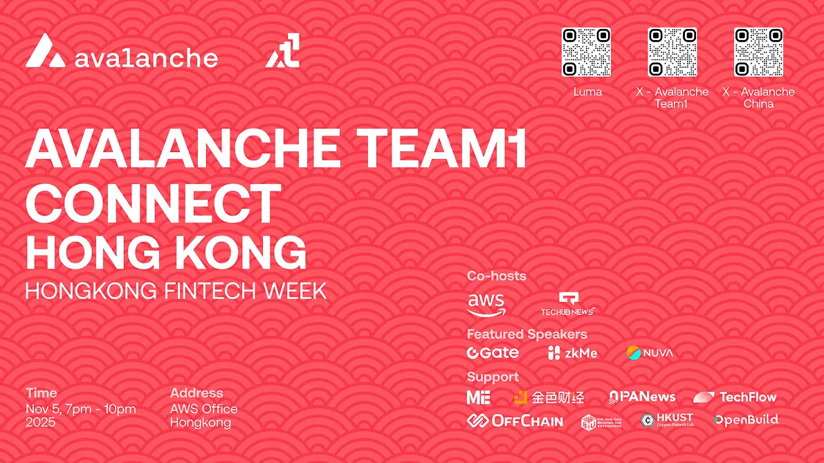 🔺 Avalanche Team1 Connect Hong Kong is coming during #HKFinTechWeek! Dive deep into the Avalanche ecosystem and the booming RWA wave. Featuring speakers from Ava Labs, Chainlink, Gate, Animoca Brands’ NUVA, zkMe, Pharos, and AWS.